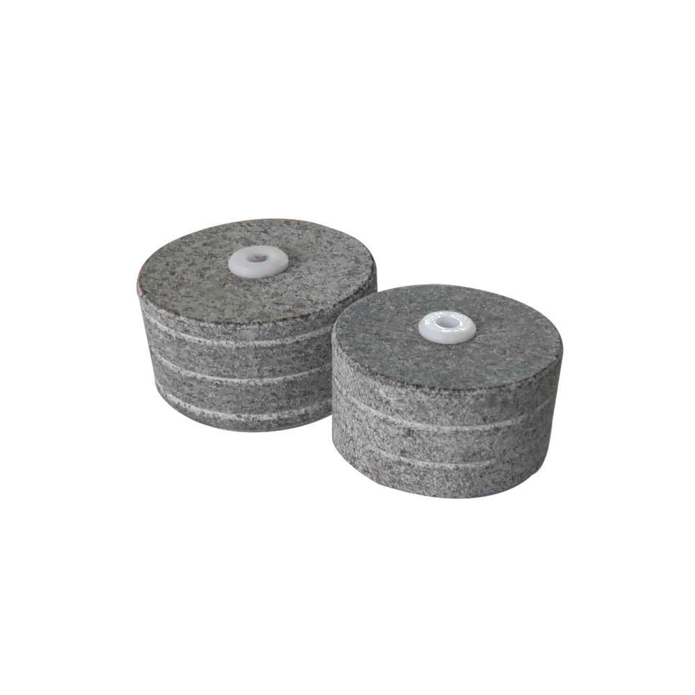 Tension of the granite stones can be adjusted to obtain different grades of shear at different stages of grinding and for different ingredients. Double granite roller stones that rotate over a granite base. This creates tremendous shear that reduces the cocoa nibs to fine chocolate liquor with a particle size of the order of less than 15 microns.